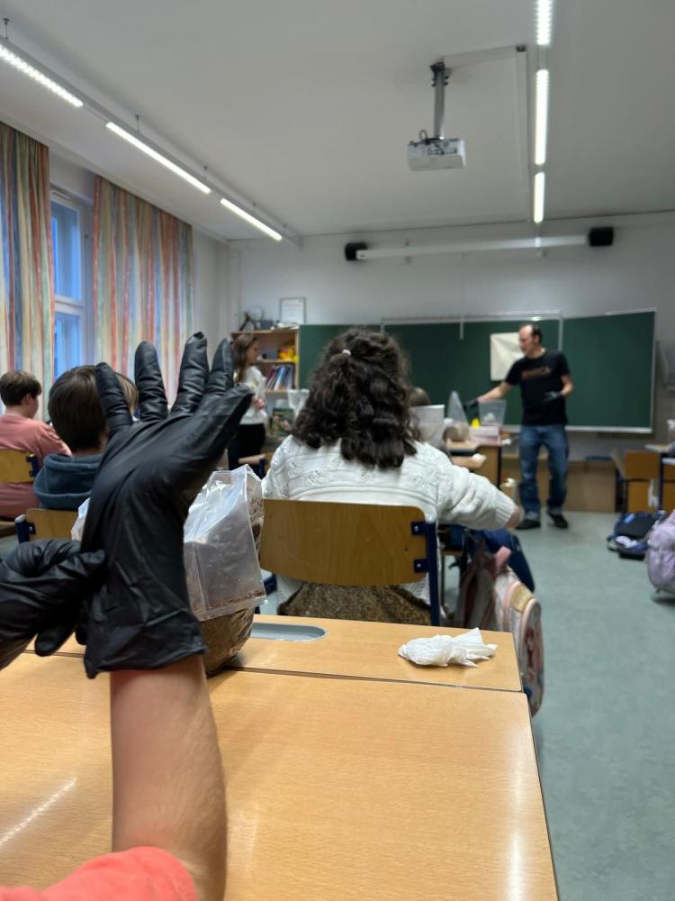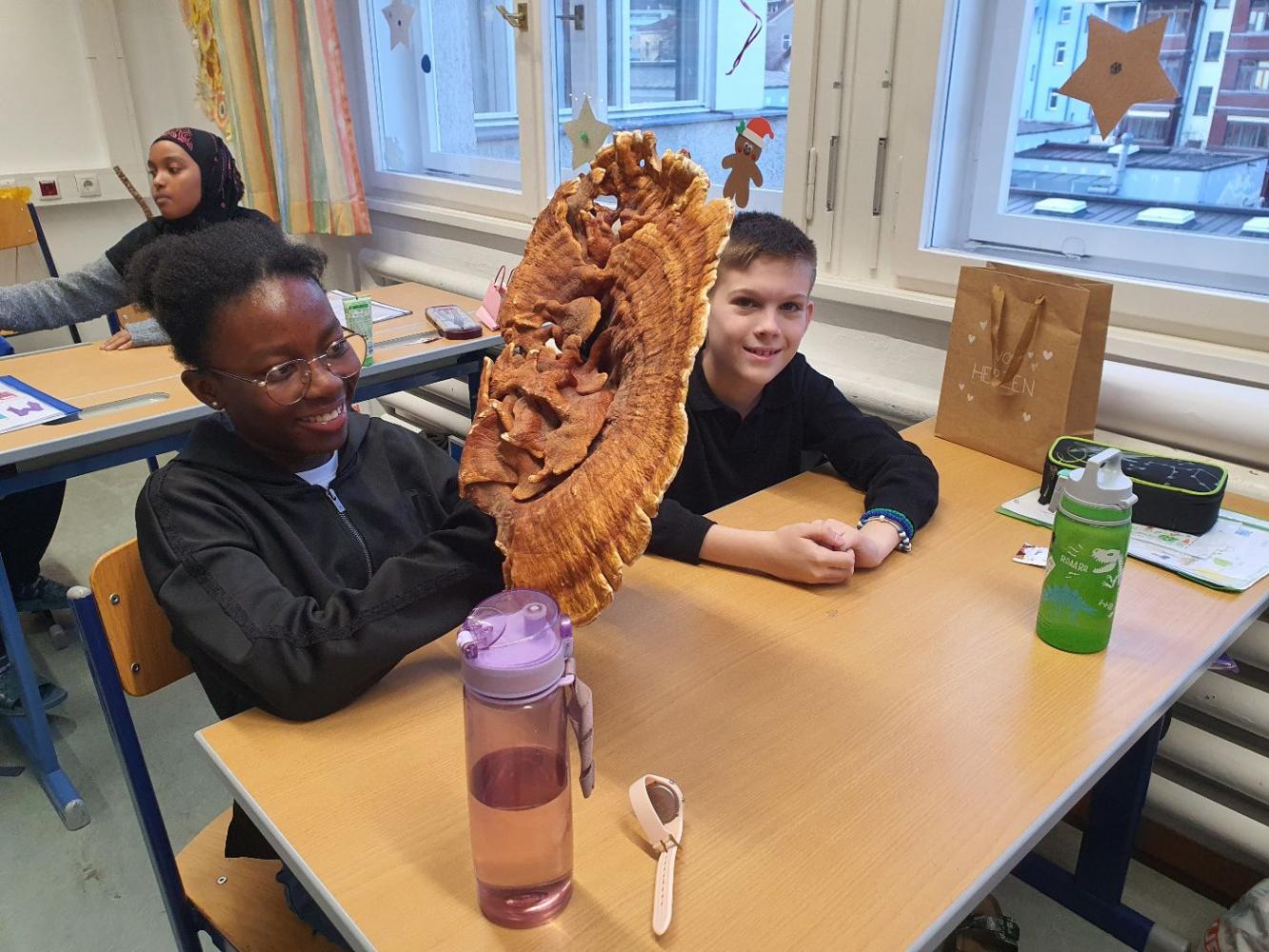 Der Pilzexperte Lee-Roy erzählte uns allerlei Spannendes über das Reich der Pilze. Wir wissen nun, dass man viele Pilze nicht nur essen, sondern auch nützliche Dinge daraus herstellen kann. In Zukunft könnte man aus ihnen sogar Häuser bauen. Möglicherweise könnten Pilze auch bald Plastik ersetzen. Wir haben auf der Erde erst 0,3% der Pilzarten entdeckt.